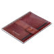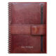 The notebook cover features the effect of a worn brown leather bound personal information manager on the cover and the image shows a strap and clasp to secure the contents. Note that the design is a digitally printed flat image on the cover and no leather is used.