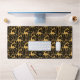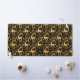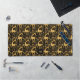 This fun desk mat features a delightful boho style pattern of a playful gold giraffe. Included in the pattern with the giraffe are a butterfly and various floral elements, along with symbols. The pattern is placed on a dramatic black background. Your monogram is in gold within a black circle banner at the bottom centre.