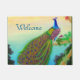 Original fine art design of an exotic Indian blue peacock by artist Carolyn McFann of TPC Studio printed on a customisable, fadeproof, mould and mildew resistant doormat for tropical peafowl fans.