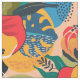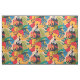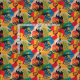 An exotic abstract floral pattern in bright shades of green, gold, blue and red.