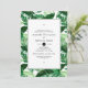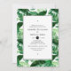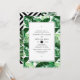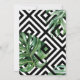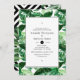 Trendy engagement party invitation featuring green tropical beach leaves and a black and white geometric pattern.