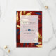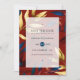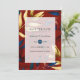 Wedding save the date cards featuring a jungle pattern in hues of blue, burgundy and gold.