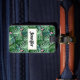Personalised luggage tag made with an image of big leafy lush green tropical leaves with a splash of pink behind. Painted with acrylics and digitised.