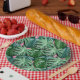 Paper plate with a summery feel. Background is a pattern of exotic tropical philodendron leaves in green. Hand painted digital image. A hint of pink in the background.