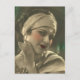 Vintage beauty colourized photograph of blushing young lady with a lush looking scarf like a headband with a gold charm hanging down over her forehead.