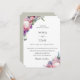 Beautiful watercolor exotic floral arrangements of king protea and foliage in chic shades of pink, purple and green, wedding invitation. Back of card features pale sage green colour.