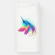 Bright, iridescent, exotic flying hummingbird on white background, painted over with multicolor, watercolor paint. Rainbow hummingbird.