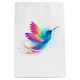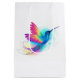 Bright, iridescent, exotic flying hummingbird on white background, painted over with multicolor, watercolor paint. Rainbow hummingbird.