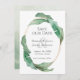 In exotic tropical style, this unique botanical wedding save the date card features a double golden oval frame embellished with tropical banana leaves. The type face pairings used in the text template convey your wedding details in elegant style. The back of the card is a coordinating blend of green in a watercolor painted abstract background. Personalise the text template with your wedding details.