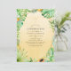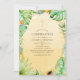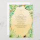 Summer confirmation invitation featuring abundant tropical greenery, strelitzia flowers, a toucan bird, pineapple, ice cream and a gold geometric frame.