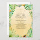Summer holy communion invitation featuring abundant tropical greenery, strelitzia flowers, a toucan bird, pineapple, ice cream and a gold geometric frame.