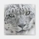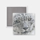 A magnet featuring a photograph of a white snow leopard gazing directly at you.