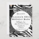 An exotic backdrop of zebra print with an elegant long black dress adorning the side with a grey floral wreath framing a white circle where you can personalise your event. Classic wild and fun