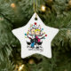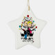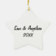A cute stick figure expectant couple with two large black dogs on a star shaped holiday ornament that you can customise with names and a date on back!