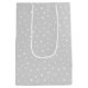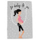 Pregnant woman on a grey and white polka dot pattern for a baby shower.