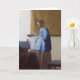 Fine art painting of expectant mother in blue top. She is standing beside a window reading a letter. Softly coloured image by Johannes Vermeer.