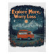 A classic scene of a camper van parked by a mountain lake, pine trees, and stars above. The phrase "Explore More, Worry Less" arches along the top, in well-worn, retro lettering for a relaxed, adventurous look.