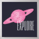 A cute illustration of Saturn in pink on a navy background with the word Explore in a fun tall font.