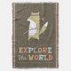 Scandinavian style Boho fox complete with feathered headband and bow, with multi-coloured "Explore the World" text on rustic brown burlap look background