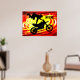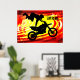 The sports action and energy of motocross athletes are captured in silhouettes of action figures demonstrating extreme tricks and stunts on their motorcycles. Digital paintings and illustrations of these teens and young men include backgrounds of bright, vivid colours and splashes and bursts of light to highlight the action. They also show off in grungy and edgy off road scenes where competitors earn their street creds showing off their motocross skills.