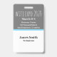 Custom Vertical Event Badge in dark grey, white and police strobe blue colours. All elements are changeable to suit your needs. Elements: name of event, date of event, location of event, event attendee name, event attendee title. Slot at top for a lanyard. Also available in horizontal orientation in this store.