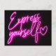 Light up someone's mailbox with this vibrant and inspiring postcard! Featuring the bold, glowing look of a hot pink neon sign, this card sends a powerful message to "Express yourself." The chic, handwritten script and a charming heart detail pop against a deep black background, creating a stunning piece of mini-art.