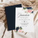 This exquisite fall floral quinceañera birthday party invitation is perfect for a tropical 15th birthday celebration. The design depicts hand-drawn pink blush, dark blue and navy whimsical flowers, inspiring elegance, class and natural beauty.