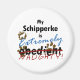 My Schipperke is Extremely NAUGHTY! Obedient is crossed out, and naughty written in. Funny Schipperke gifts that dog lovers will find hilarious! The design also features mud splatters (with a silhouette inside), paw prints, and bite marks out of the word obedient.