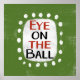 "Eye On The Ball" is a cute text design in light green with black and red text, along with a white accent shape and white textured whimsical dots surrounding it.