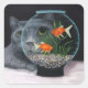 A beautiful Grey Russian Blue long haired cat is looking into a round goldfish bowl with a magnified eye and face. The goldfish look startled as they swim above the many colourful little pebbles.