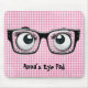 Black frame eyeglasses with eyeballs and eyelashes on white and pink gingham background.