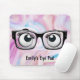 Big eyeballs with eyelashes and black-framed glasses on a marble abstract background.