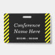 This eyecatching badge design features the message "CONFERENCE ADMIN!". It also features yellow and black coloured caution stripes. The back features a customisable event name and event date(s). [~Z0000286]