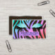 Trendy, bright zebra pattern, glam business cards for estheticians, eyelash and makeup artists, stylists, hair stylists, beauticians, cosmetologists, nail salons, beauty bloggers, and other beauty-related businesses and professions- Front has bright pastel, zebra pattern animal print background in shades of purple, aqua, turquoise, pink, and orange with black zebra stripes. Personalised name and professional title on front in modern, black lettering on translucent, matching purple and pink frame. Above are turquoise glam glitter, makeup eyeshadow eyes with eyelash extensions. Simple, faux metallic silver frame border. Matching solid background on back with personalised contact details, including social media, in coordinating teal lettering. Note: All images are printed. Not actual glitter or metal. We have more eyelash business cards for makeup artists and salon professionals, plus this matching eye makeup design on other girly products in our Zazzle.com/angela65* shop.