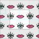 White fabric with a kitschy seamless pattern of glossy pink lips and blue eyes with yellow eye-shadow and long lashes.