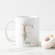 Letter F monogram floral. Letter F in golden brown texture accented with green watercolor compound leaves, flower blossoms and gold dust. Personalised with name in matching font.
