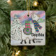 The festive "Fa La La Llama" ceramic ornament is a stylish and cute decoration to personalize with a name for any holiday tree. The adorable design sparkles with a sassy and whimsical llama adorned with a trendy blanket, scarf and attractive Christmas present. The lovely llama prances cheerfully across a winter white scene with a snowy tree and colorful blue, pink and green sky. The back of the ornament is winter white, all ready for your custom personalization.