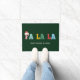 Colourful, festive, typographic "FA LA LA" santa hat, dark-green, holiday door mat. Customise with your family signature.