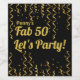A festive black and gold fabulous fifty birthday party design with shiny gold curly ribbons and gold flecks and fun fonts. #fab50 #letsparty