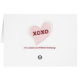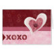 Scrapbook style Valentine's Day greeting card displaying sewn X's and O's, pink ribbon, paper or cloth-like hearts with button and floral patterns inside and out.