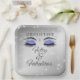 Celebrate the fiftieth birthday milestone with this elegant and glamourous black and periwinkle birthday party square paper plates. Adorned with periwinkle blue glittered eyes and diamond sparkles. Personalise it with a name. Created by Simply Farmhouse Press on Zazzle.