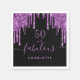A trendy and glamorous 50th (or any age) birthday napkin. A classic black background decorated with dark purple colored faux glitter drips, paint dripping look. With the text: 50 and fabulous. Personalize and add a name. Light purple colored text. The word Fabulous is written with a modern hand lettered style script with swashes.