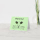 This Thank You card has the face of a cat illustrated in black with bright green eyes and long whiskers on a light green background.