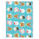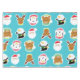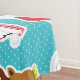 Faces of Christmas tablecloth, colourful and fun, features a white polka dots on blue background with Santas, snowmen, reindeer, teddy bears, and penguins!