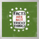 Bold text reading "Facts Are Not Tricky Things" is centred against a green background. The black and dark orange text sits on a white rectangle with large textured white dots around it, providing a playful contrast against the solid colour backdrop.