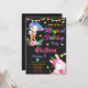 This colourful invitation features happy little unicorn, dancing little cute fairy with blue hair, coloured garland, some flowers and rainbows around.