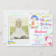 This colourful invitation features happy little unicorn, dancing little cute fairy with blue hair, coloured garland, some flowers and rainbows around.