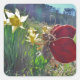 Fairy with red wings and purple dress Smelling in the yellow Daffodils Flowers Fairy and Photo By Artist Sandy Closs Fairy, fairies, pixie, pixies,fantasy,flowers, butterfly , butterflies, red, yellow, purple,spring fairy-tale, fairyland