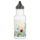 Brown hair fairy kid's small stainless steel water bottle for a little girl personalised with her name. It features a floral illustration with cute butterflies, bees, ladybugs, mushrooms, stars, sunflowers, roses, and tulips.