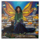 A fairy with orange and yellow wings sitting on stone steps that lead to perhaps the Fairy realm. The African American Fairy is not alone, she is with her guardian doberman dog on this Autumn Day.